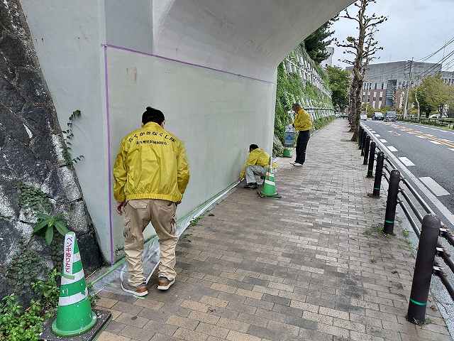 らくがきなくし隊の準備作業として、都市高速道路 橋脚部にある落書き落としを行いました。